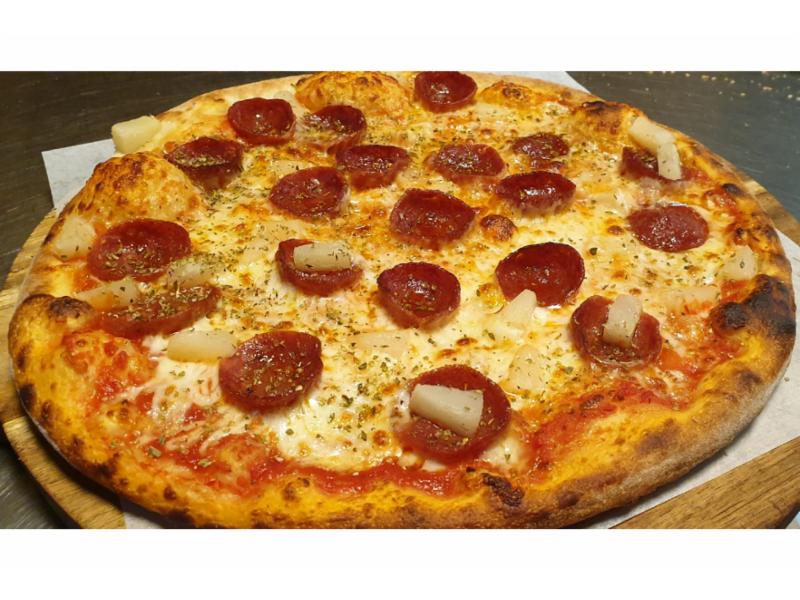 Tomatsaus, ost, pepperoni, ananas