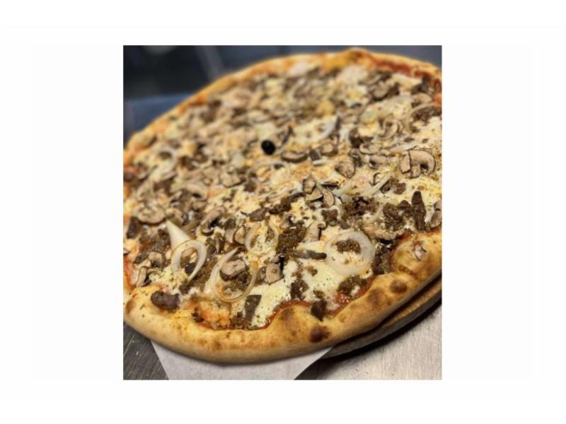 Tomatsaus, ost, biff, kjøttdeig, løk, champignon