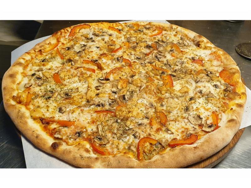 Tomatsaus, ost, kylling, paprika, champignon, løk