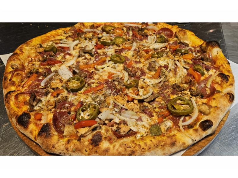 Tomatsaus, biff, kjøttdeig, skinke, kylling, pepperoni, ost, bacon, champignon, paprika, løk, jalapenos